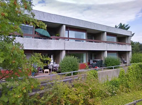 2-vær. rækkehus placeret i en firkant/gård rundt om p-pladser og fælles lokale for beboerne.
