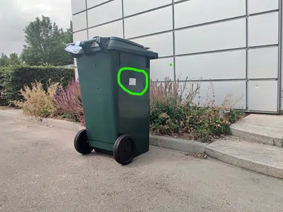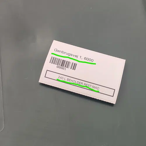 - Find et lille klistermærke på siden af affaldsbeholderne. Her vil adressen fremgå. Se hvordan du finder klistermærket på billederne herunder.
