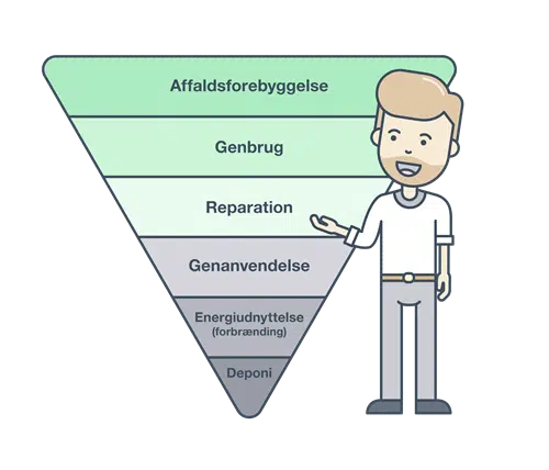 Både i Kolding Kommune, Danmark og i resten af EU hjælper affaldshierarkiet med at prioritere, hvad man gør med affaldet: Jo højere man kan komme i pyramiden, jo bedre.
