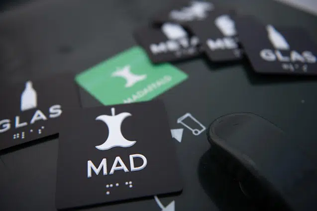 - Mærkerne er forsynet med de let forståelige symboler samt punktskrift/braille, således at blinde og svagsynede let kan skelne de forskellige affaldsbeholdere fra hinanden.