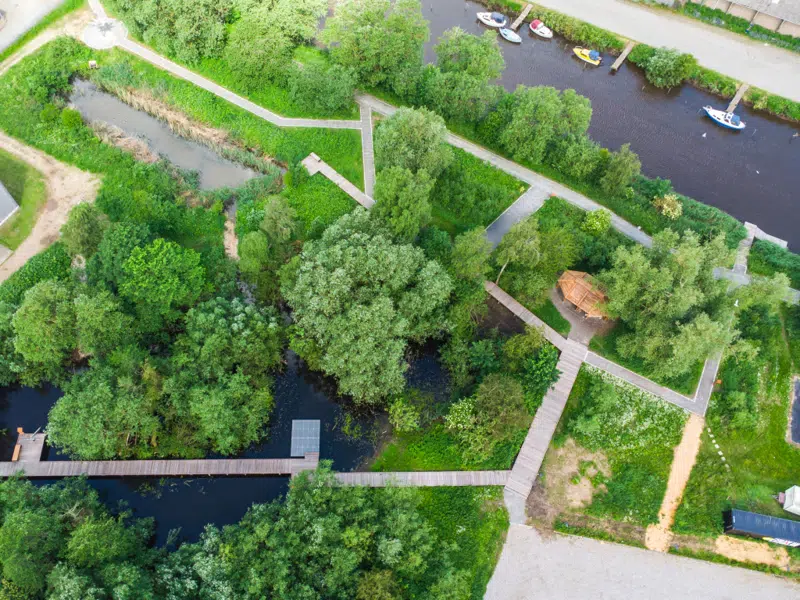Åhaven set fra oven med bålhytte, gangbroer og vandhuller. Foto: BlueKolding.
