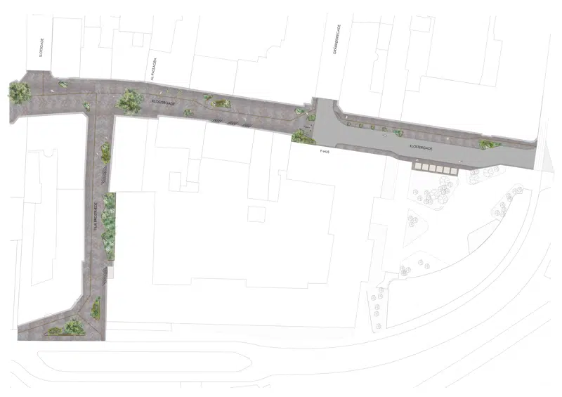 Illustration af Klostergade/Lille Brostræde med ny samlende belægning, nye plantebede med stauder, løgplanter og buske og nye opholdsmuligheder i byrummet.