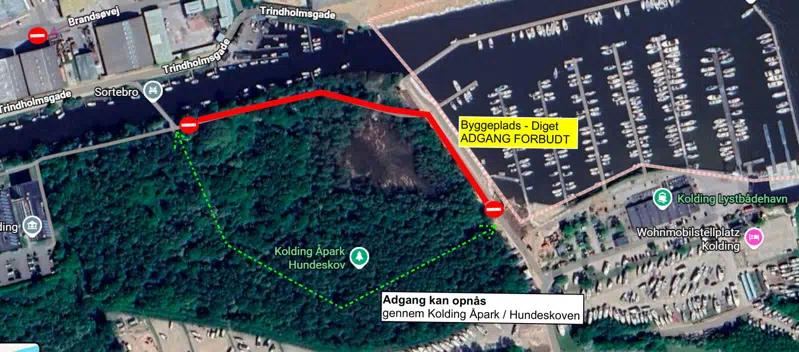 Mellem Østerbrogade og Marina Syd er der indgang til hundeskoven. Under den midlertidige lukning af Fjordstien vil det stadig være muligt at skrå igennem skoven ud til Marina Syd.