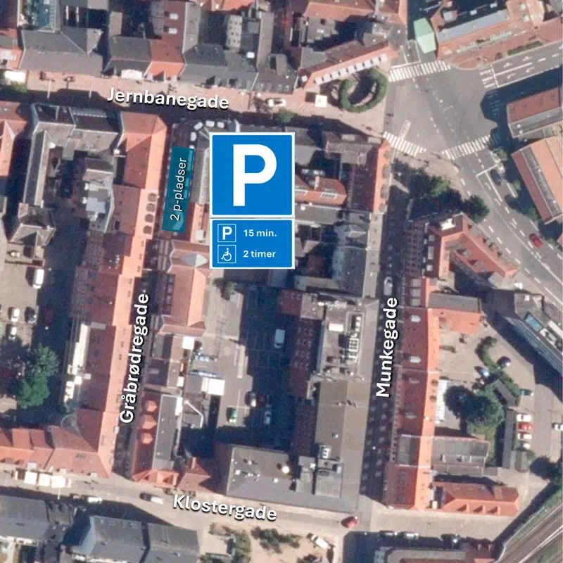 I Gråbrødregade er der to handicapparkeringspladser med to timers tidsbegrænsning. De pågældende pladser kan også benyttes af andre bilister til korttidsparkering (15 minutter).