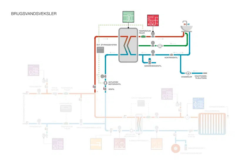 - Sekundærside: Den side, hvor frem og retur for brugsvandet er koblet til