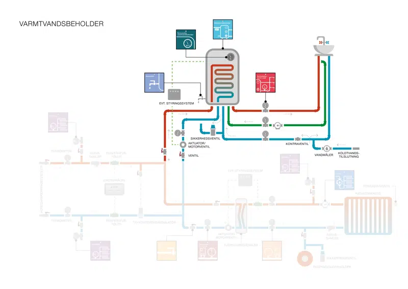Ventiler styrer og regulerer vandflowet på hver side af varmtvandsbeholderen.