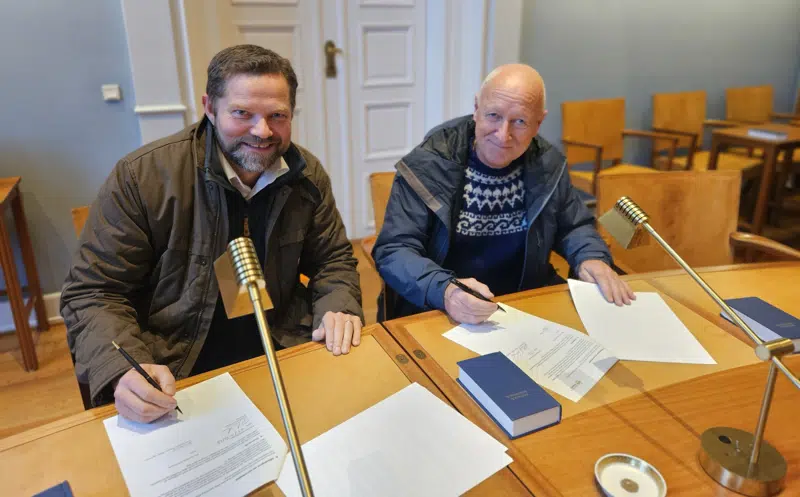 Poul Erik Lauridsen (tv.) og Jørn Chemnitz underskriver KLIMA+ aftalen.