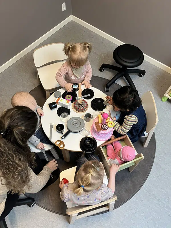 Der er i bygningen indtænkt flere grupperum, som giver mulighed for at opdele stuerne i mindre grupper baseret på fx alder eller leg. I både grupperum og nicher kan børnene få mulighed for at fokusere, fordybe sig og skabe et mindre fællesskab og et rum i rummet.