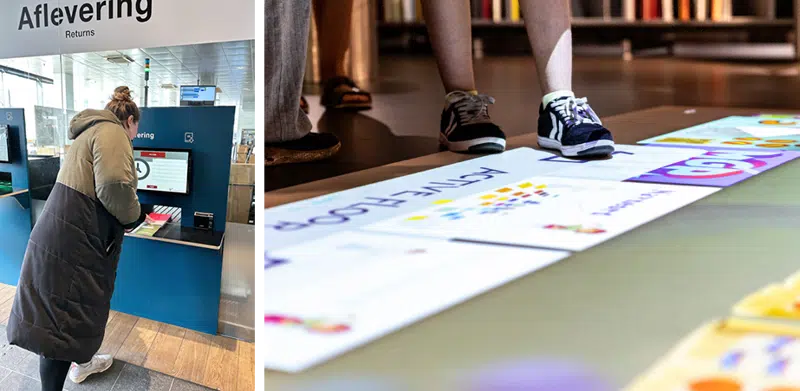 På biblioteket i Kolding møder borgerne smarte digitale løsninger – som Active Floor, der kombinerer leg og bevægelse for børn, og en selvbetjeningsmaskine, der gør aflevering af materialer nemt og hjælper personalet med sortering.
